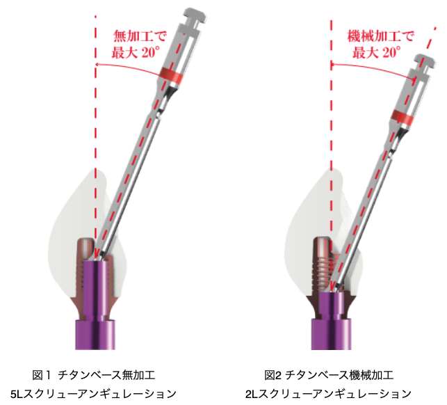 ハーキンドチタンベースⅡは、ハーキンドアバットメントスクリュー5Lを使用することで、無加工でアクセスホールを20°傾斜させることが可能です。(図1)